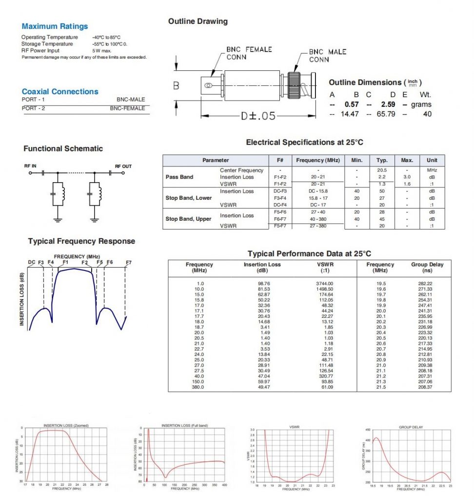 50Ω 20 to 21 MHz Band Pass Filter