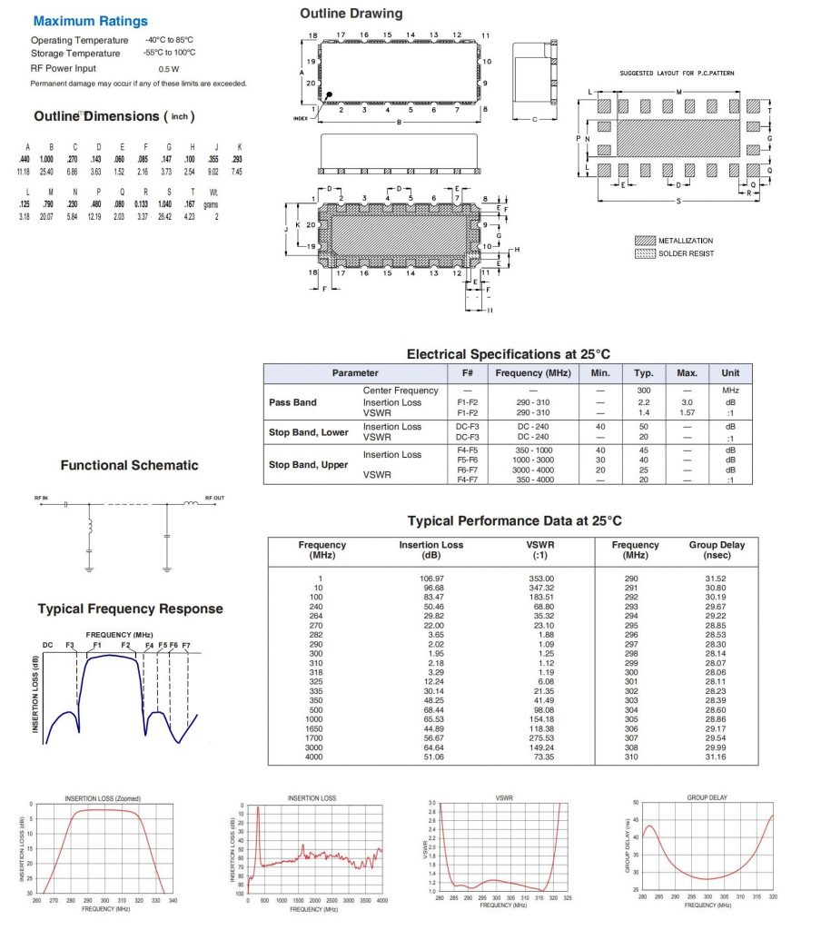 50Ω 290 to 310 MHz Bandpass Filter
