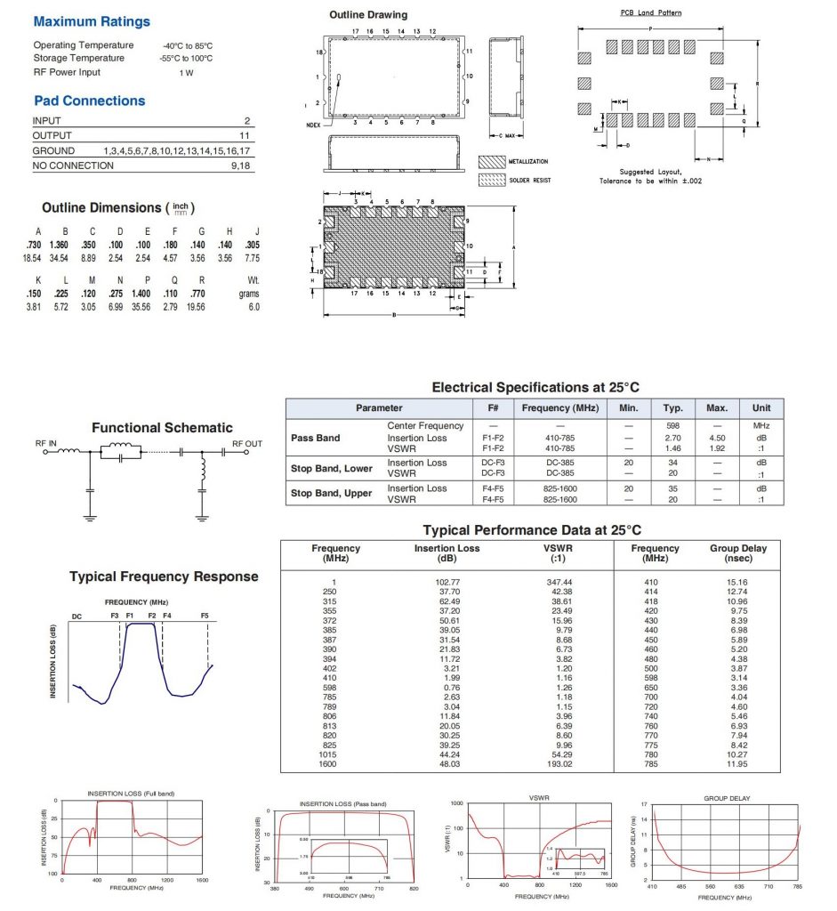 50Ω 410 to 785 MHz Bandpass Filter