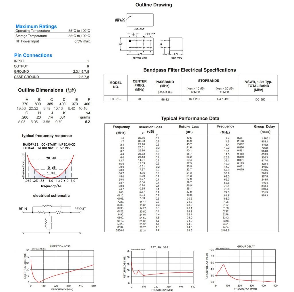 50Ω Constant Impedance 58 to 82 MHz Bandpass Filter