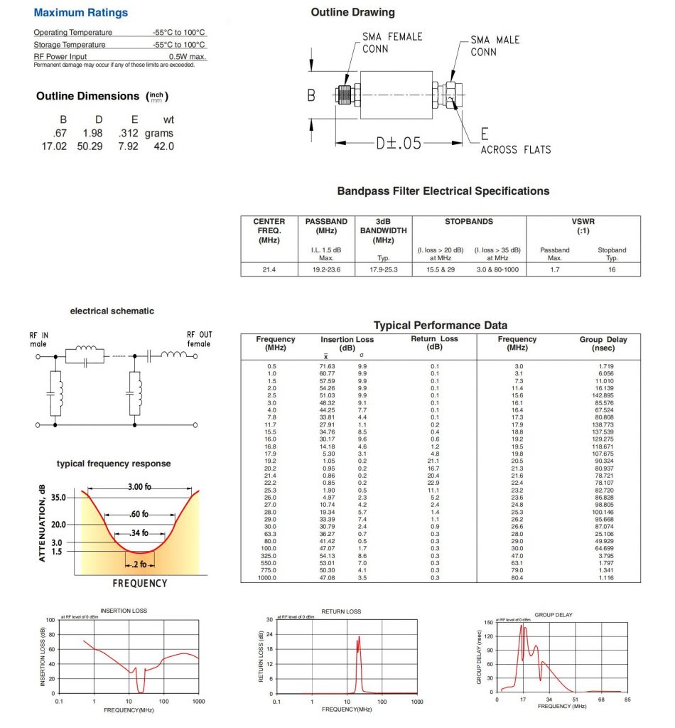 50Ω Elliptic Response 19.2 to 23.6 MHz Bandpass Filter