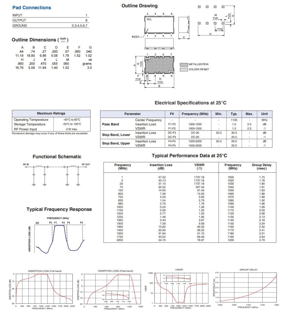 50Ω 1000 to 1200 MHz Bandpass Filter