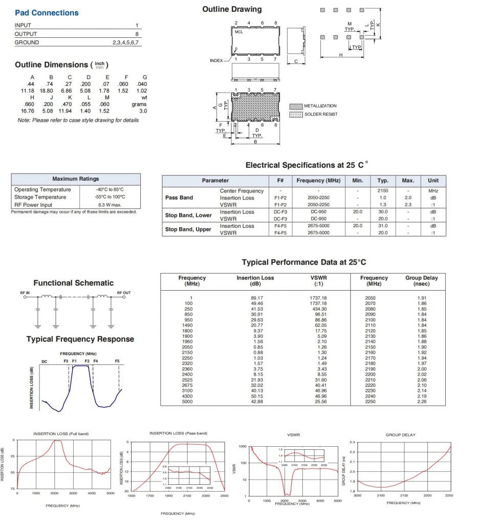 50Ω 2050 to 2250 MHz Bandpass Filter