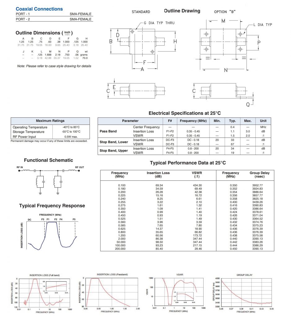 50Ω 0.35 to 0.45 MHz Bandpass Filter