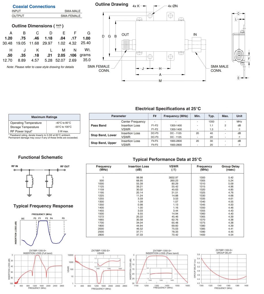 50Ω 1300 to 1400 MHz Bandpass Filter