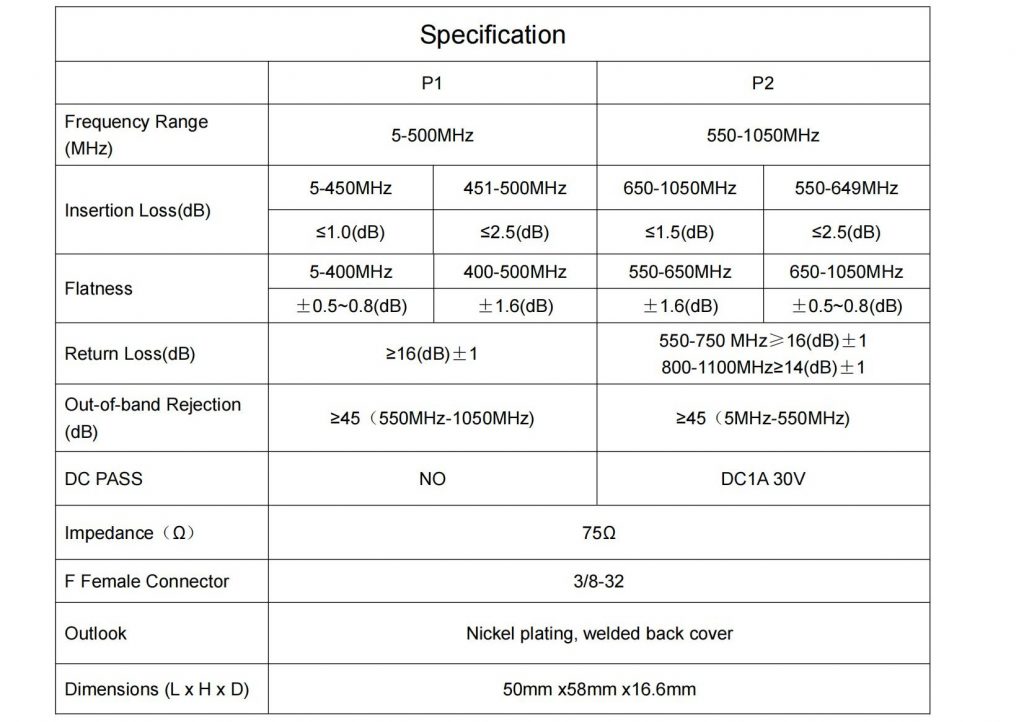 Next Product Diplexer (5-500& 550-1050MHz)$0.00Features:Frequency Range: TV(5-500MHz) IRIS (550-1050MHz)Impedance(Ω): 750hmConnector: F Female ConnectorDimensions: 50mm x58mm x16.6mm Diplexer (5-500& 550-1050MHz) quantity Add to cart SKU: Diplexer-500550 Categories: 75ohm, Diplexer Description Description Prices and sales term are subject to our final confirmation Catalog Download Related products Quick View Quick View75ohm, FilterHigh Pass Filter $0.00Add to cart Quick View Quick View75ohm, FilterLow Pass Filter With Return Path $0.00Add to cart Quick View Quick View75ohm, FilterTriple Band Pass Filter $0.00Add to cart